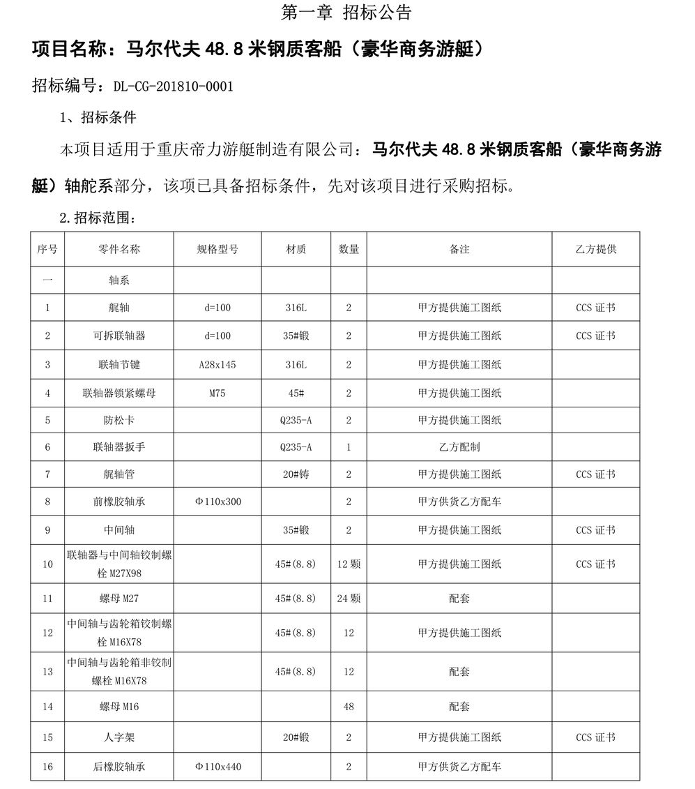 馬爾代夫48.8米鋼質客船(豪華商務游艇)軸舵系部分招標