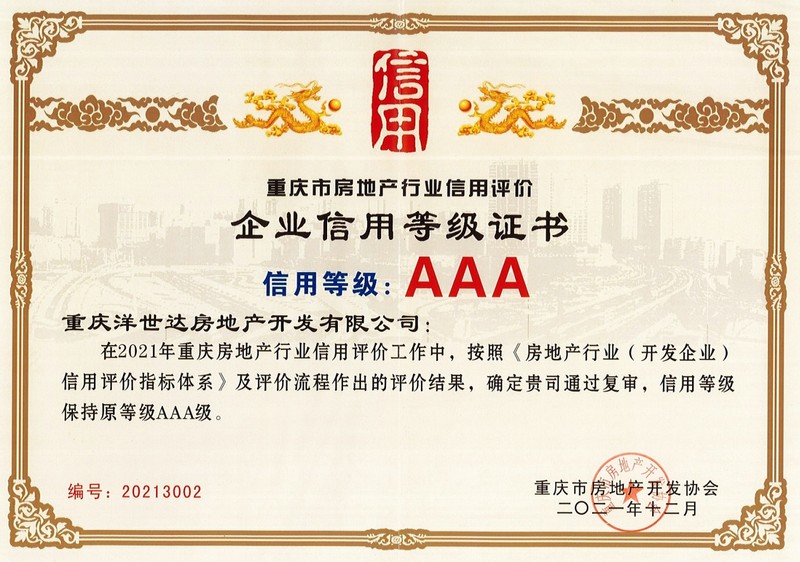 重慶洋世達房地產開發有限公司在由重慶市房地產開發協會組織開展的“重慶市房地產行業信用評價”活動中,再次通過2021年度開發企業信用評價復審,獲得《企業信用等級證書》,信用等級:AAA 。