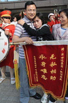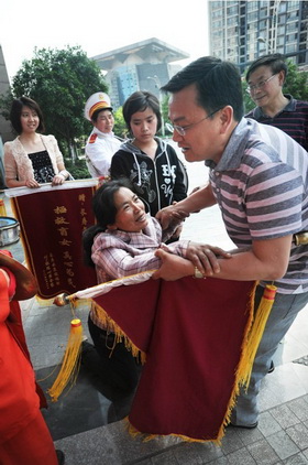 4月8日,洋世達集團公司總裁、凱誼公司總經(jīng)理楊勝愛心捐款10萬元,用于救助因?qū)W習(xí)用功過度導(dǎo)致失明的16歲女孩陳心萍,使她得到及時的救治并終于重獲光明。25日下午,復(fù)明后的陳心萍和母親特別請來一支鼓樂隊,敲鑼打鼓來到“洋世達?圣天湖”售房部,將一面寫有“無私相助 永生難忘”的錦旗送到楊總手中。得知接錦旗的就是她們母女一直想見的恩人時,陳心萍的母親撲通跪到地上,連聲說:“你是我家的恩人呀”,楊總急忙上前扶起她,并熱情接待了母女倆。